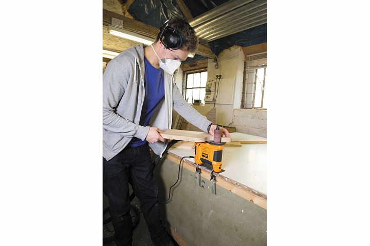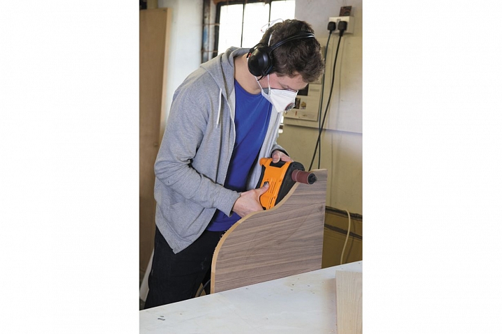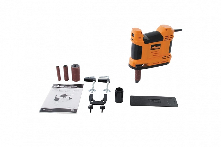 Triton TSPSP650 – уникальный инструмент, работающий по тому же принципу, что и осцилляционно-шпиндельные станки. Его основное назначение – шлифовка криволинейных кромок под прямым углом к плоскости заготовки. За счет осциллирующего движения улучшается качество шлифования (дефекты абразива не оставят продольных полос) и повышается ресурс расходных материалов (втулок). Последние выполнены быстросъемными и фиксируются на шпинделе единственным винтом с головкой под захват рукой. Их меняют не только в случае износа, но и в зависимости от степени кривизны кромки.