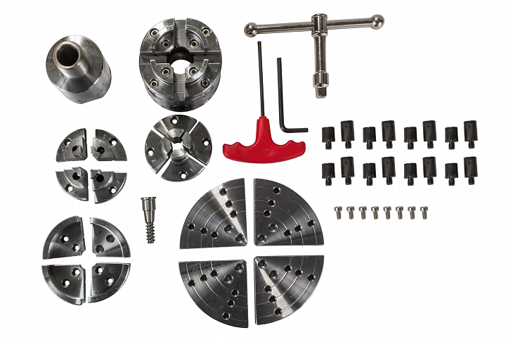 Токарный патрон, диаметр 70 мм, присоединительная резьба 1х8''TPI, комплект сменных кулачков, адаптер с 1х8''TPI на M33х3.5, зажимной ключ под квадрат, делительное приспособление на патроне, винтовая вставка, ключ шестигранный, кейс.