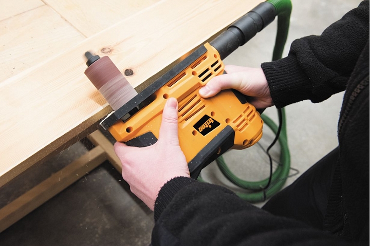 Triton TSPSP650 – уникальный инструмент, работающий по тому же принципу, что и осцилляционно-шпиндельные станки. Его основное назначение – шлифовка криволинейных кромок под прямым углом к плоскости заготовки. За счет осциллирующего движения улучшается качество шлифования (дефекты абразива не оставят продольных полос) и повышается ресурс расходных материалов (втулок). Последние выполнены быстросъемными и фиксируются на шпинделе единственным винтом с головкой под захват рукой. Их меняют не только в случае износа, но и в зависимости от степени кривизны кромки.